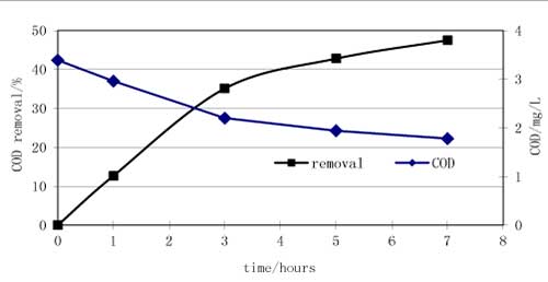 圖4給出了COD去除率和濃度隨吸附時間的曲線。根據實驗結果,初始3小時吸附后COD濃度由3.39 mg / L降至2.2 mg / L,相當于去除率的35.1%。隨后趨于穩定,最低值為1.78 mg / L,最高去除率為47.5%。