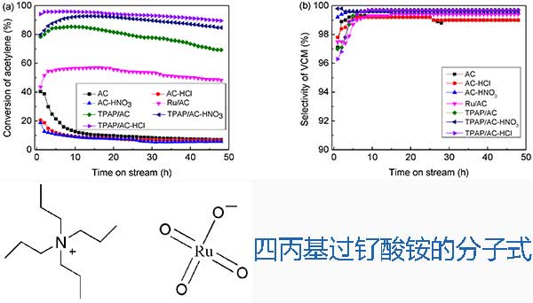 雖然乙炔的加成反應(yīng)與氯化氫是氯乙烯單體(VCM)的直接合成的重要途徑,在傳統(tǒng)的工業(yè)用過的催化劑是活性炭載的HgCl2,其擁有一個(gè)嚴(yán)重的環(huán)境污染和人員危險(xiǎn)其高毒性和易燃性。再加上汞資源短缺,非汞催化劑的研究一直是重點(diǎn)。發(fā)現(xiàn)納米結(jié)構(gòu)載體,如Al2O3 ,金屬有機(jī)骨架(MOFs)衍生的固體堿,介孔二氧化硅納米顆粒[MSN] ,金屬氧化物載體(MO x)等。通常用于催化反應(yīng)。但由于其物理化學(xué)性質(zhì)不同,其中有些不利于乙炔氫氯化的有效支持。受益于表面上發(fā)達(dá)的孔結(jié)構(gòu)和相互作用,活性炭成為乙炔氫氯化反應(yīng)的理想材料,載體表面的官能團(tuán)可以影響活性炭的性質(zhì)。高價(jià)釕是乙炔氫氯化Ru催化劑的關(guān)鍵活性組分。通常通過改變RuCl 3獲得高價(jià)釕物種或載體,關(guān)于釕配合物催化劑與高價(jià)釕催化劑在乙炔氫氯化反應(yīng)中的應(yīng)用相關(guān)的文獻(xiàn)很少。因此,本文采用一定濃度的鹽酸或硝酸處理交流負(fù)載四丙基過釕酸銨(TPAP)制備了Ru基活性炭催化劑,并對乙炔氫氯化反應(yīng)的催化性能進(jìn)行了評價(jià),希望找到一種容易制備,更高活性,更穩(wěn)定和經(jīng)濟(jì)的無汞催化劑。
