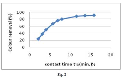 活性炭劑量對顏色去除的影響如圖4所示。觀察到每單位重量活性炭的顏色去除隨著活性炭負載的增加而降低。另一方面,隨著活性炭負載從0.5增加到2.0g / l,去除百分比從28%增加到97%。發現隨著活性炭的劑量增加至2g/l,顏色的降低增加,并隨著活性炭劑量的進一步增加保持幾乎恒定。