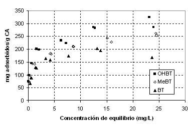 在圖1上的原始活性炭BT的(F),所述OHBT和濕潤活性炭吸附等溫線至pH 5。它被理解的是,最大吸附發生用于OHBT隨后MEBT目前, BT是最不吸附的。活性炭吸附容量的增加與苯并噻唑分子中甲基或羥基取代基的存在有關。