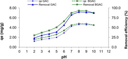 圖3。活性炭和改性活性炭在不同pH值下的脫鋁效率和吸附容量。吸附劑用量:2g / L,鋁濃度:10.3mg / L,接觸時間:24小時,攪拌速度:250rpm。
