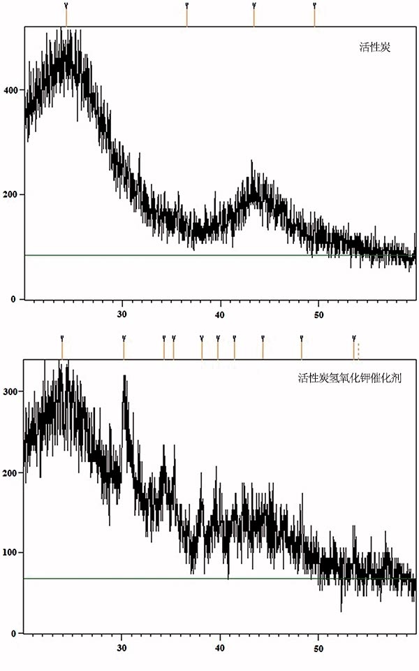 圖1.活性炭和活性炭氫氧化鉀固體堿催化劑的XRD。