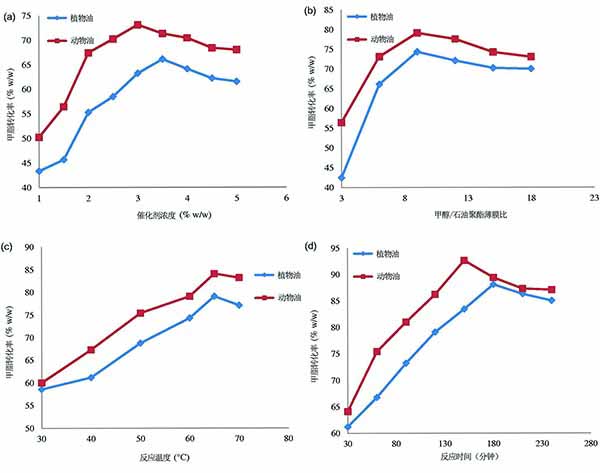 測試的非食用油的低酸值使得能夠通過活性炭氫氧化鉀催化的酯交換反應直接形成甲酯。因此,優(yōu)化了工藝參數(shù),例如固體堿催化劑的量,甲醇與油的摩爾比,溫度和酯交換過程的持續(xù)時間。使用催化劑與油的酯交換通過測試不同量的催化劑進行研究,催化劑的范圍為1.0-5.0%wt%,其中增量為0.50%,如圖3(a)所示。甲醇與油的摩爾比,溫度,時間和反應的攪拌速率分別為6:1,60℃,120分鐘和600rpm。觀察到甲酯產率隨著催化劑量的增加而逐漸增加,這是因為催化劑的量越多,活性中心的數(shù)量越多,這反過來導致更高的轉化率。然而,與動物油脂相比,植物油通過所述固體催化劑的酯交換需要(3.5%w/w)催化劑以產生甲酯的最大產率,其中動物油脂在催化劑的(3.0%w/w)下表現(xiàn)出最高的甲酯產率。實現(xiàn)各種原料的最大轉化率所需的催化劑的最佳量的差異可歸因于原油的酸值以及油的類型。植物有是一種初榨油,與經過油炸過程的動物油相比,沒有經過任何熱處理,油炸過程會顯著影響油的化學成分。然而,由于高粘度混合物,固體催化劑的量超過最佳量導致較高的傳質阻力,導致甲酯產率較低。